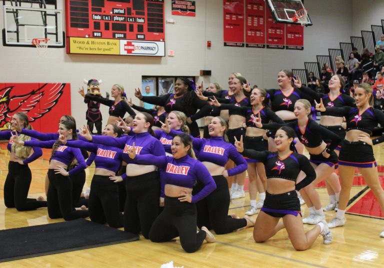 Contributed image Members of Missouri Valley College’s cheer and dance team wow Marshall High School students with their energy-driven performance at the 2023 MHS Homecoming assembly. The Viking mascot also generated enthusiasm with his antics, especially in connection with the Owl mascot. MVC’s participation in the Homecoming assembly and parade are another facet of the partnership the two schools are continuing to build.
