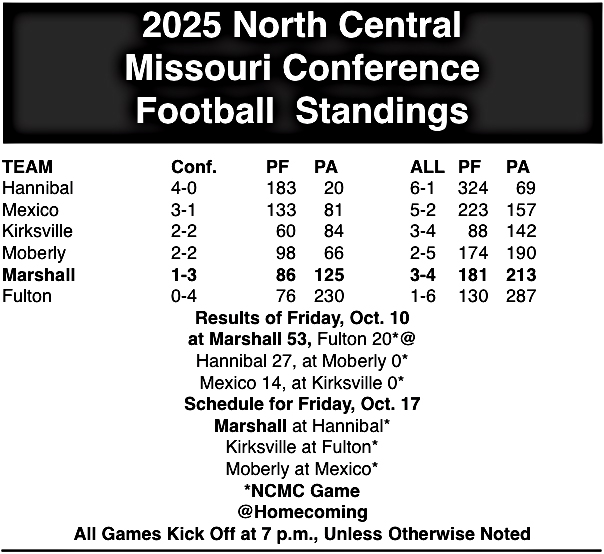 Home Uncategorized Week 8: Owls go after fourth win of season at Hannibal Friday night Week 8: Owls go after fourth win of season at Hannibal Friday nightOctober 16, 2025Uncategorized by Hobby King/SPORTS EDITOR A week ago, the Marshall Owls continued their dominance of the Fulton Hornets on the gridiron, winning 53-20 in front of… Login to continue reading Login Sign up for complimentary access Sign Up Now Close Previous Post Slater woman sentenced to life for 2021 murder Next Post Sweet Springs Board of Aldermen approves trash pickup change, joins MSDC Featured Local Savings -